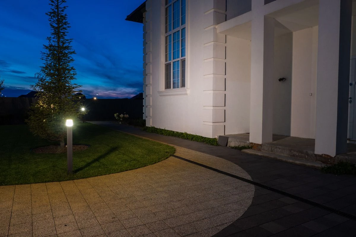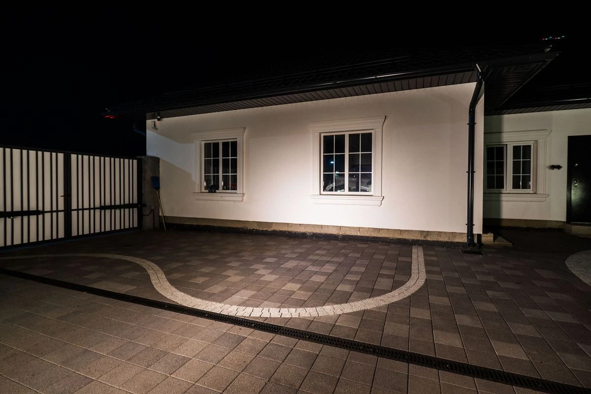 Главная задача состояла в том, чтобы визуально в современном стиле объединить дом и остальную территорию. Было принято решение выбрать две различные фактуры тротуарной плитки: это серая плитка, которая смотрится современно. А в пару к ней — была выбрана плитка с мраморной крошкой (белой и черной), которая отлично сочетается с фасадом дома.