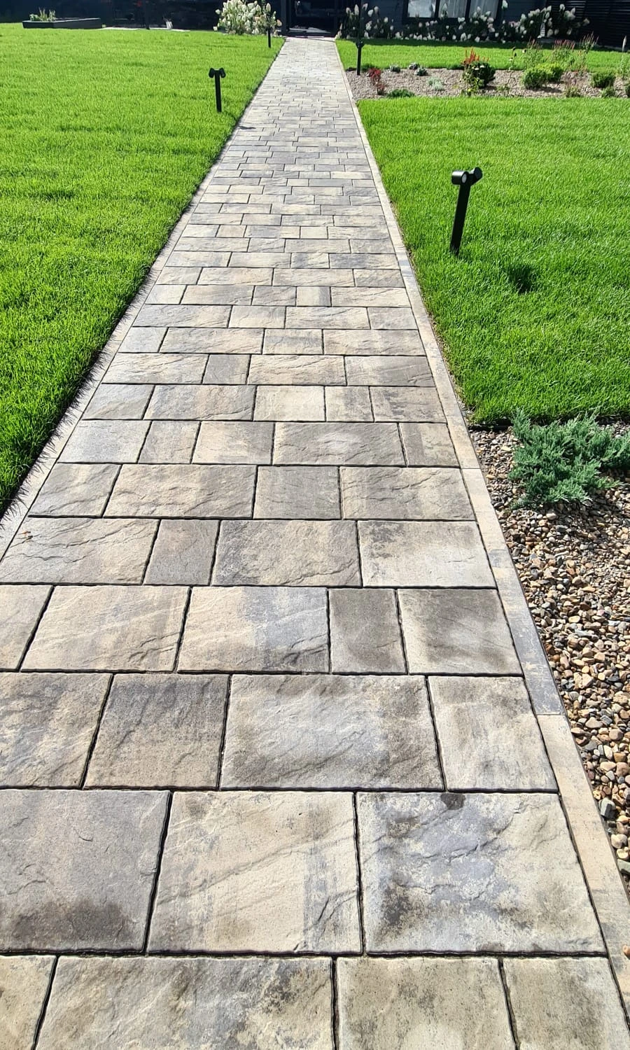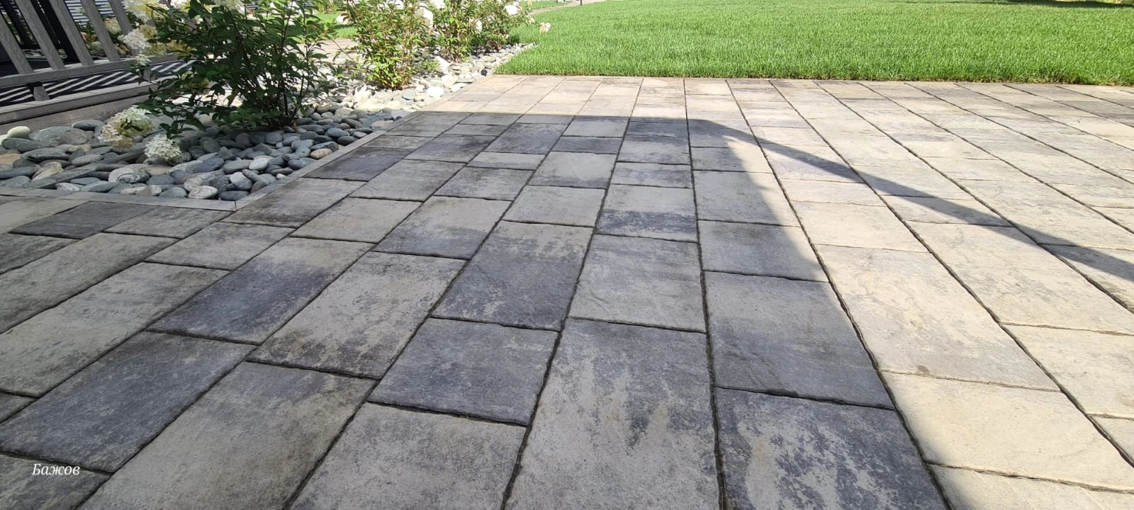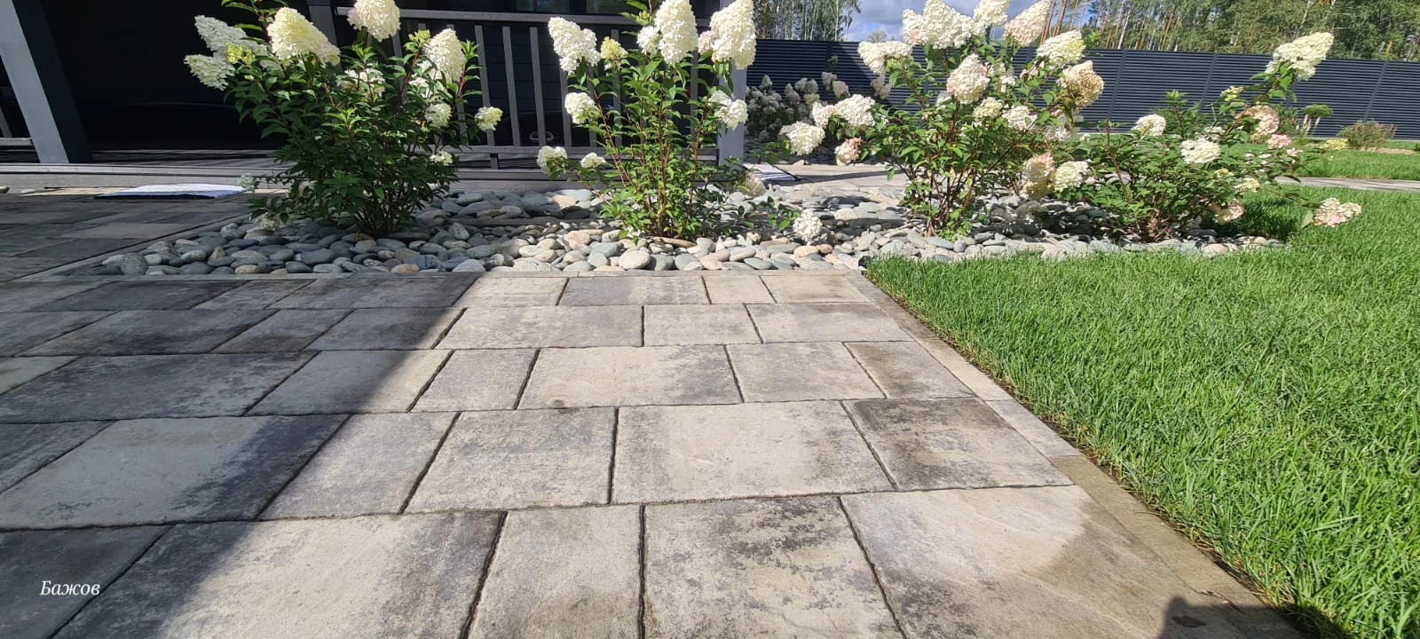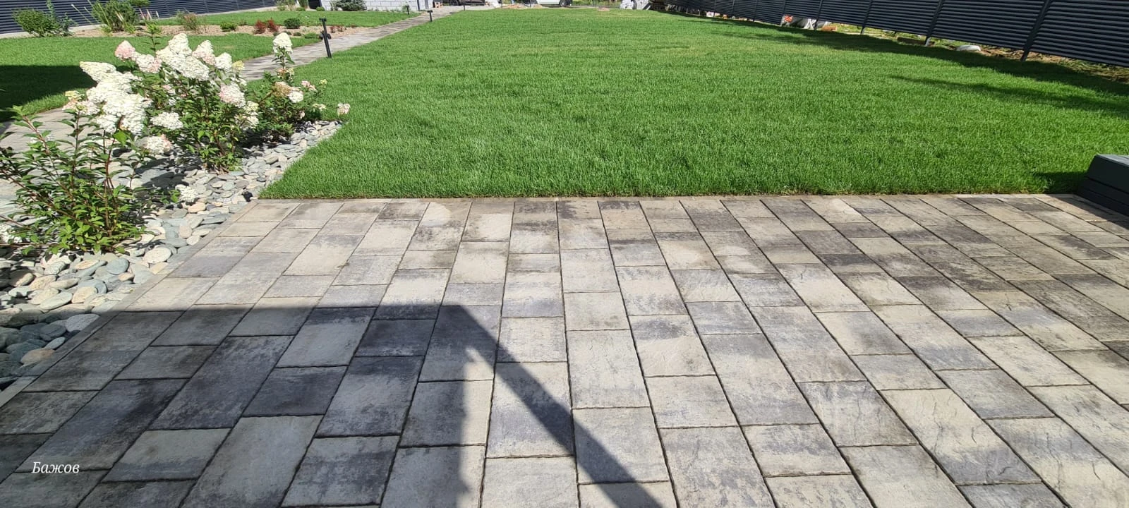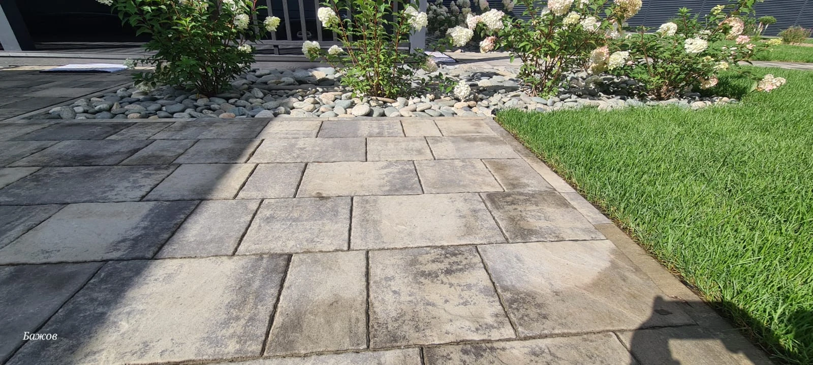 На фотографиях плитка только после кладки, швы засыпаны песком и пролиты водой для более плотной усадки песка. После высыхания и подметения брусчатка приобретает естественный товарный вид. Зоны без травы в дальнейшем усажены цветами и газоном.