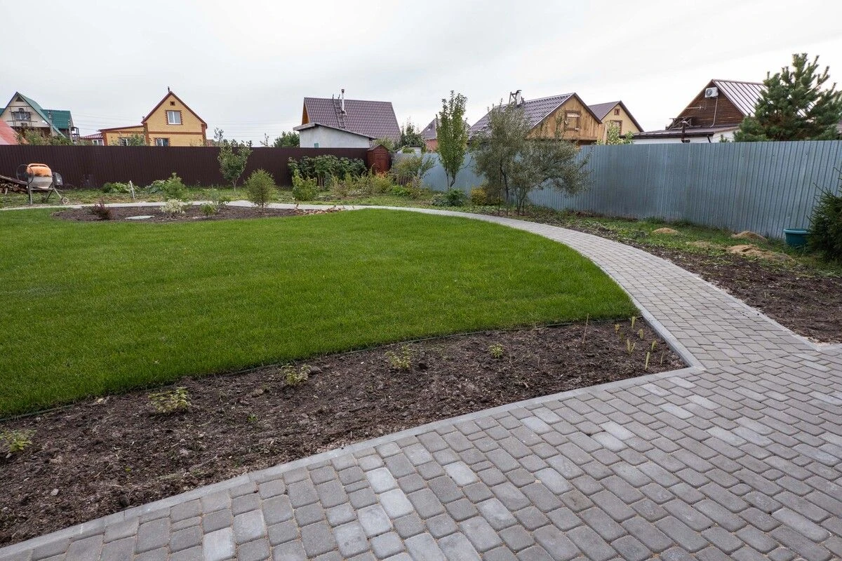 Для пошаговых дорожек выбрана плитка Ла-линия (прямоугольник) 600х300х80 мм по 2 штуки в ряд. Стандарт, цвет белый.