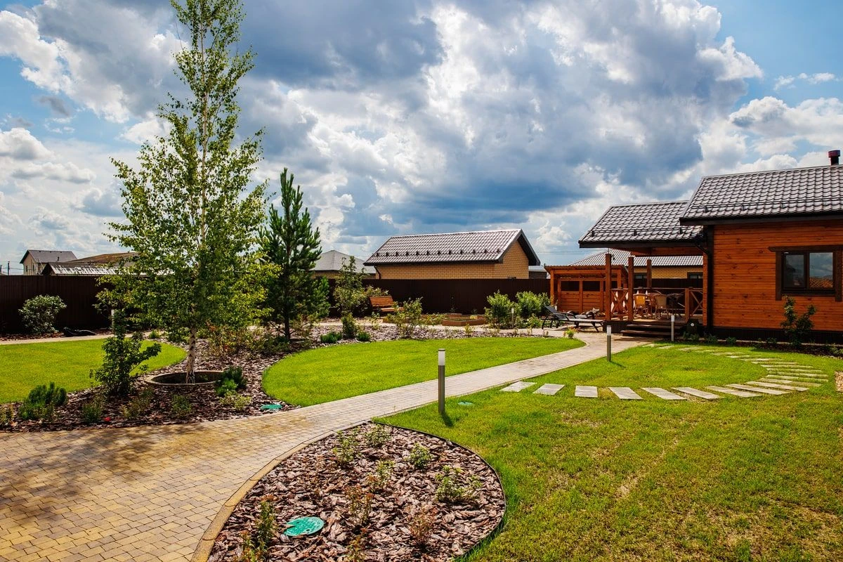 Выполнено мульчирование открытых поверхностей земли с помощью коры лиственницы. Это не позволяет расти сорнякам и служит декоративным покрытием. Пошаговые дорожки из крупноформатной плитки Литос придают участку эко-стиль и легкости. Сейчас шаговые дорожки в саду очень востребованы.
