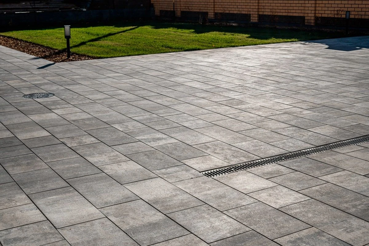 Для мощения территории частного дома была выбрана брусчатка Трио в толщине 60 мм. Комплект состоит из 3-х плит: 300х300 мм, 450х300 мм, 600х300 мм. В результате укладки плитки получается необычный узор. В дополнении к плитке Трио был использован бордюр-поребрик в цвете Габбро.