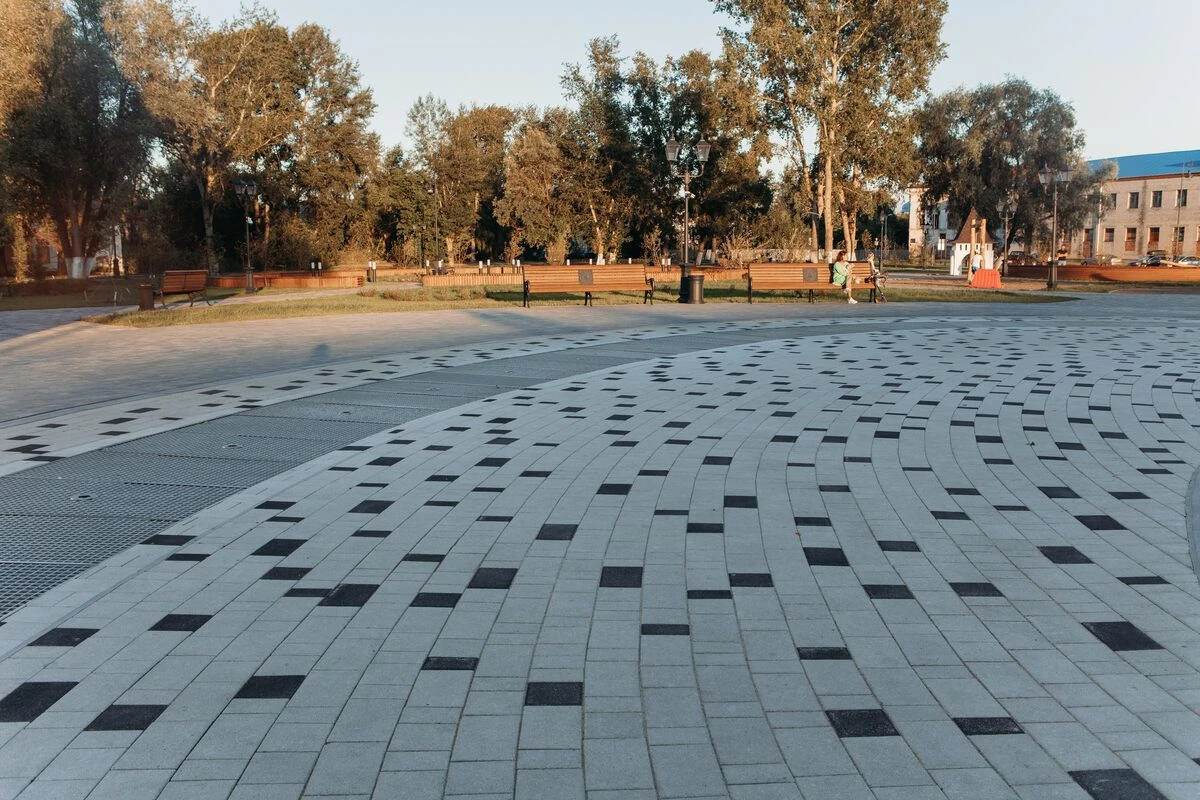 - Благоустройство тротуарных дорожек: На всех пешеходных дорожках форма Старый город и Абрис. А в зоне фонтана плита Старый город, в фактуре Мрамор, белого и черного цвета.