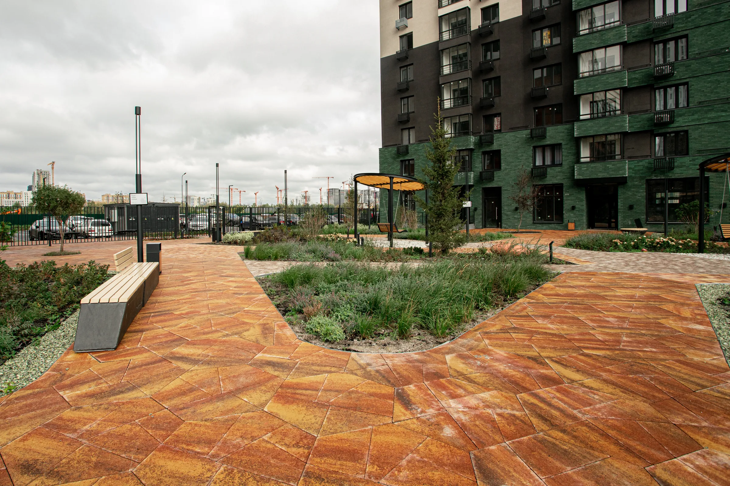Территория жилого комплекса "О Два" в Тюмени благоустроена с применением твердых покрытий из тротуарной плитки в толщине 60 и 80 мм.