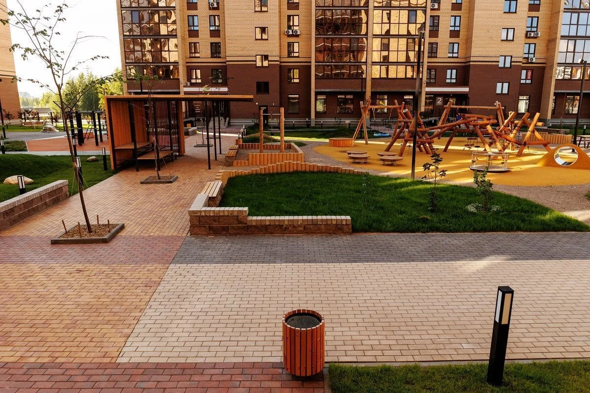Визуально области не отделяют разные части двора, однако добавляют эффект разнообразия в дополнение к выполненным работам по благоустройству площадки. На проекте используется тротуарная плитка «Поревит» в цветах Белый, Черный, Каир и Клинкер.