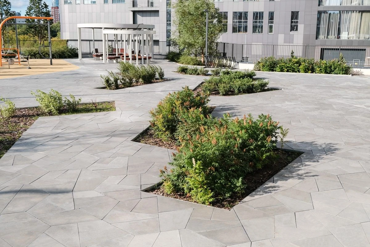 Для благоустройства территории внутри жилого комплекса использована тротуарная плита: